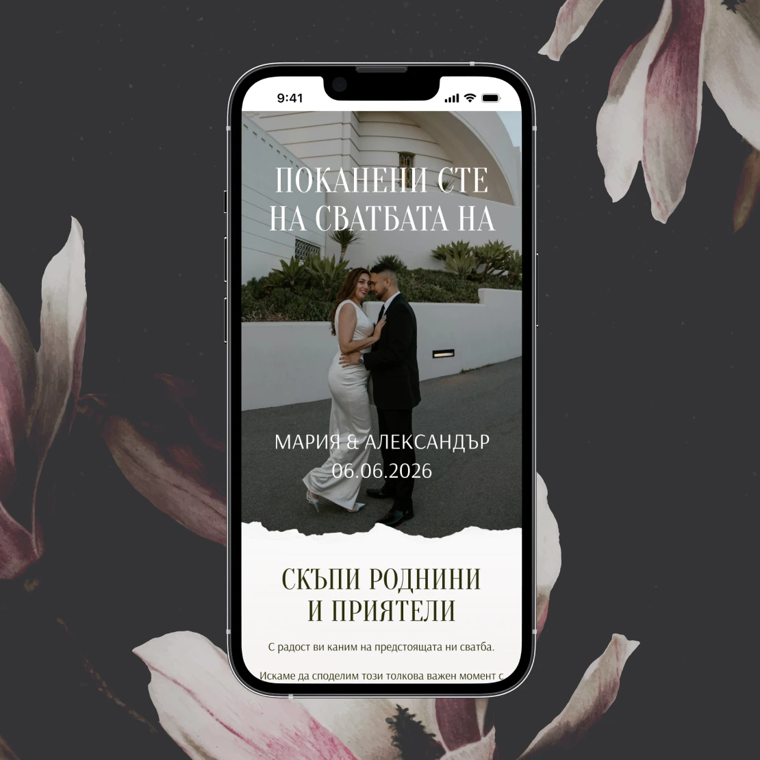 дигитална покана в стила на избрания дизайн съдържаща вашите имена, дата, QR код и изписан адреса на сайта ви