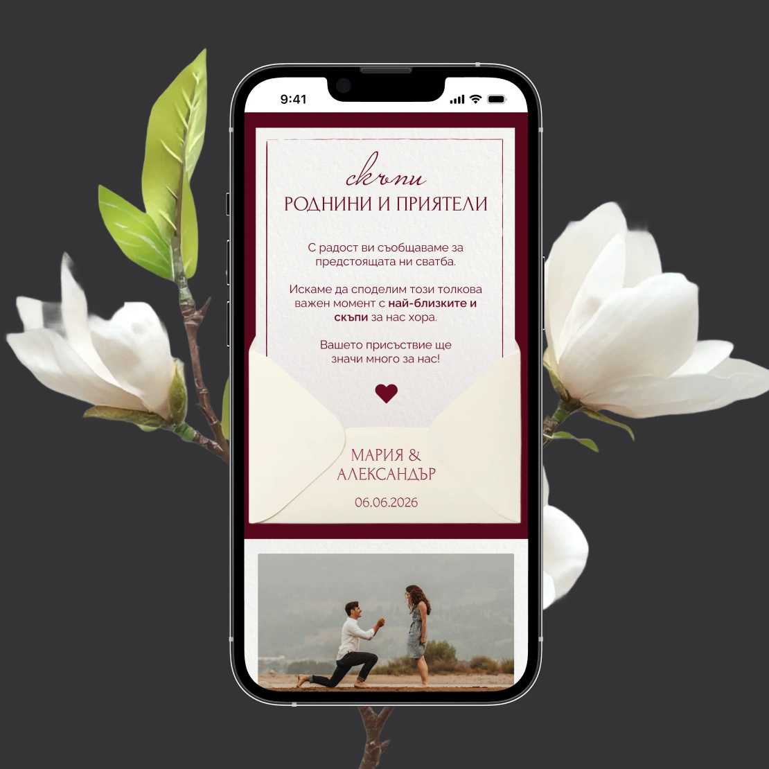 дигитална покана в стила на избрания дизайн съдържаща вашите имена, дата, QR код и изписан адреса на сайта ви